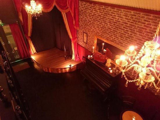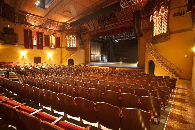 Beyond the concession booth are two entrances leading to the main seating and stage area. Red velvet curtain surround the area and give it a traditional look. The stage is large enough for live shows, plays, cabaret or concerts and a screen can be brought down for films or as backdrops to the performances.